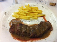 Cardápio com apenas uma opção de prato principal: entrecôte, um corte de contrafilé bovino com molho secreto e fritas.
