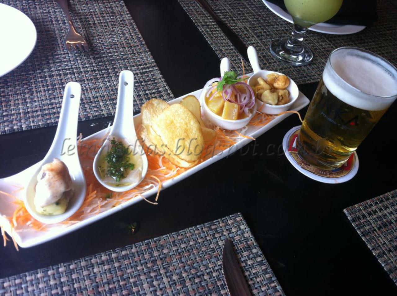 Causa de frango, chincharron (carne de porco), anticucho de camarões