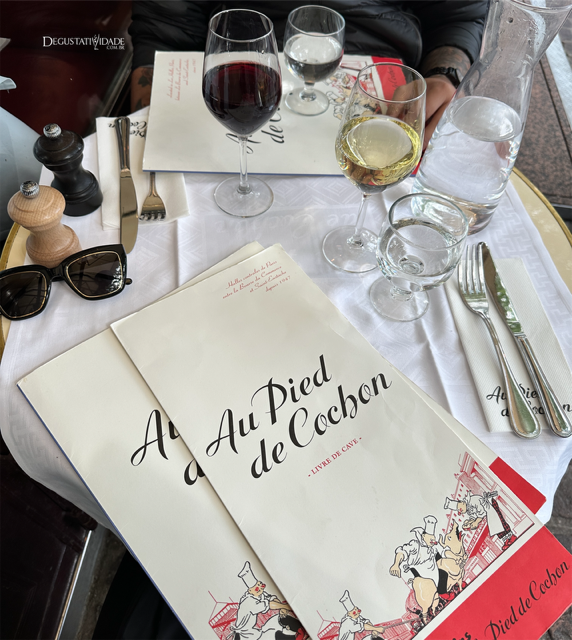 Como o nome sugere, a especialidade é o pé de porco, iguaria humilde que se tornou símbolo da cozinha francesa, apreciada tanto por trabalhadores quanto por membros da realeza. Pedimos taças do Chenás Domaine Lemaitre (9,50€) e do Bourgogne Chardonnay Domaine Paquet (vin biologique) (9€).