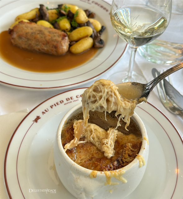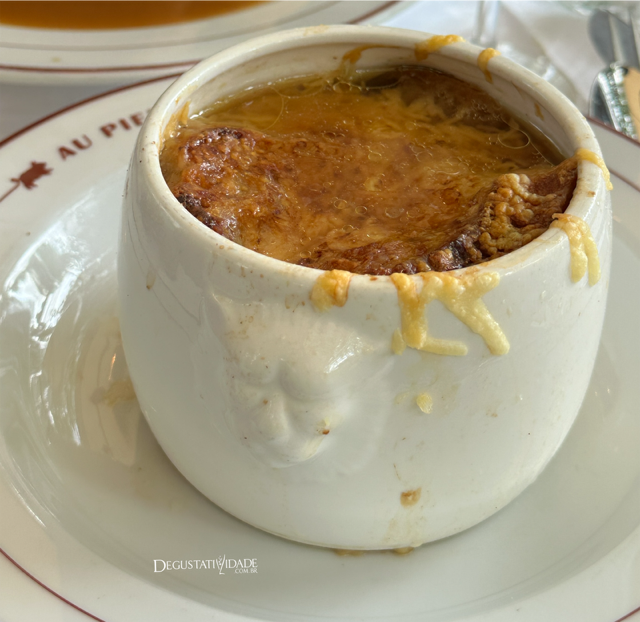 A sopa de cebola também é bem famosa, com uma generosa camada de queijo gratinado por cima (10,50€).