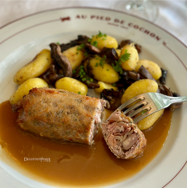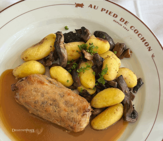 Como exímia apreciadora de todas as partes do suíno, adorei o “Pied de cochon farci façon Périgourdine” (26,50€), que consiste no pé de porco desossado e recheado com foie gras e guarnecido com cogumelos champignons e batatas grenaille.