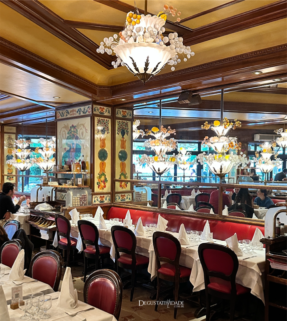 Inaugurada em 1947, a decoração segue o estilo Belle Époque com lustres imponentes, cadeiras em couro vermelho e mesas com toalhas brancas.