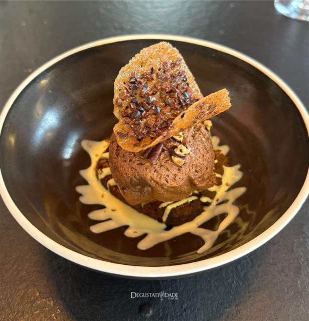 e para finalizar uma mousse de chocolate amargo com bolo de castanhas.