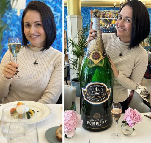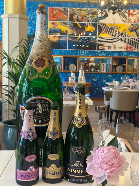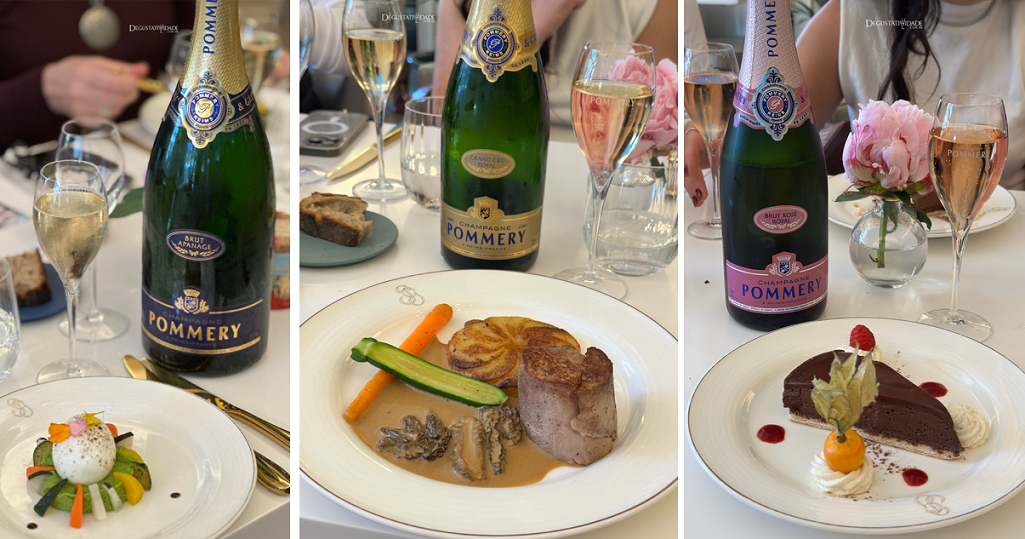 Degustamos a Pommery Cuvée Brut Apanage em garrafa Magnum (170€), a Vintage 2009 (110€), e a Brut Rosé Royal (95€) ao longo do almoço harmonizado.