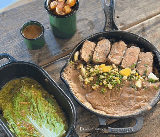 Sua versão apresenta o filezinho suíno grelhado com ervas frescas ao molho de mostarda com melaço de cana, cachaça e pimenta verde, acompanhado de tutu de feijão bem lisinho com farofa de ovo, torresmo, batata Asterix rústica frita na banha, couve chinesa no molho de missô e laranja com lâminas de alho. Está puro conforto!