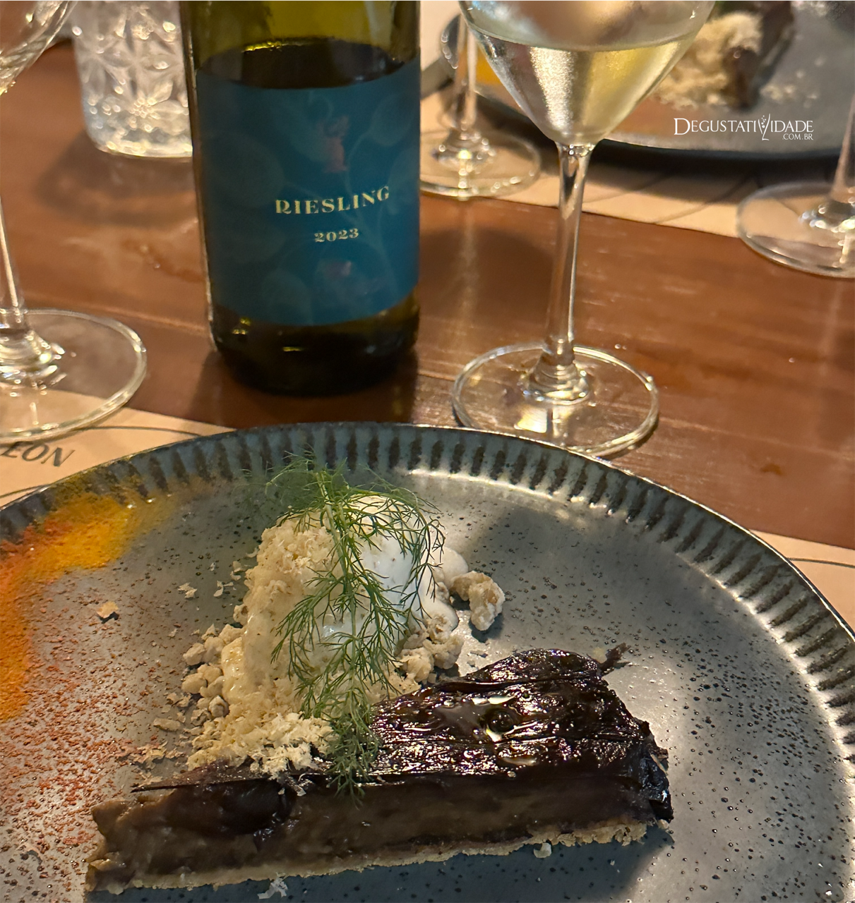 O jantar no Villeon teve início com um surpreendente Riesling húngaro, cultivado em uma região de colinas e solos vulcânicos. “A variedade Riesling costuma apresentar uma nota combustível e defumada, porém, nesse solo, entrega mais fruta e cítrico ao vinho”, ressalta Paula Brazuna, gerente comercial da importadora Berkmann. O Tuzko Riesling 2023 (R$147) foi servido com tarte tatin de berinjela, sorvete artesanal de gorgonzola dolce e nuvem de nozes.