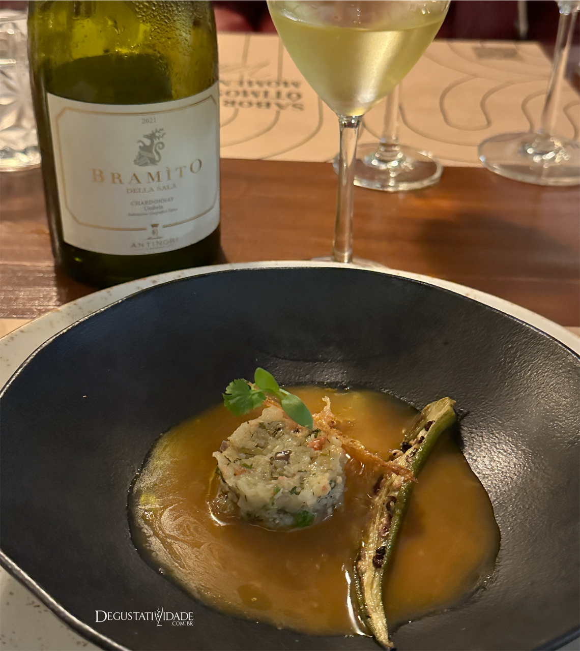 Vizinha da Toscana, a Umbria é uma região que produz vinhos com muito frescor. Inspirado na Borgonha, o enólogo Renzo Cotarella vislumbrou, há cinco anos, uma microrregião propícia para a Chardonnay, aos pés de um castelo medieval de 1350. O Bramito Della Sala Umbria IGT 2021 (R$472) é uma assemblage de diferentes lotes da uva Chardonnay, tratados separadamente em carvalho e em cubas de inox. Complexo, cremoso e estruturado, harmonizou com a potência do bisque de lagostin, servido com tartare de camarão e quiabo grelhado na brasa.