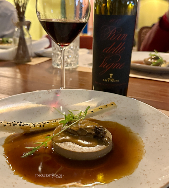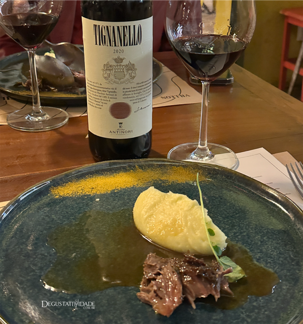 Tignanello é uma marca da Antinori que revolucionou não só a indústria de vinhos na Itália como também o mercado vitivinícola do mundo. Em 1970, Piero Antinori contrariou a aristocracia ao plantar videiras francesas em Chianti. Foi considerado um fora da lei e seguiu em frente com as uvas Cabernet Sauvignon na Itália, que deu origem aos supertoscanos. O Tignanello Toscano IGT 2020 (R$1.890) emociona além da história – um vinho de contemplação, realmente bem especial. Para esse ícone, o  chef preparou uma paleta de cordeiro servida de colher, de tão macia e suculenta, acompanhada pelo aveludado “la purèe de Joël Robuchon”. “O segredo é trabalhar a batata quente, cozida com casca, entrar com o leite quente e com manteiga gelada” revela Felipe Leão, chef expert em técnicas francesas.