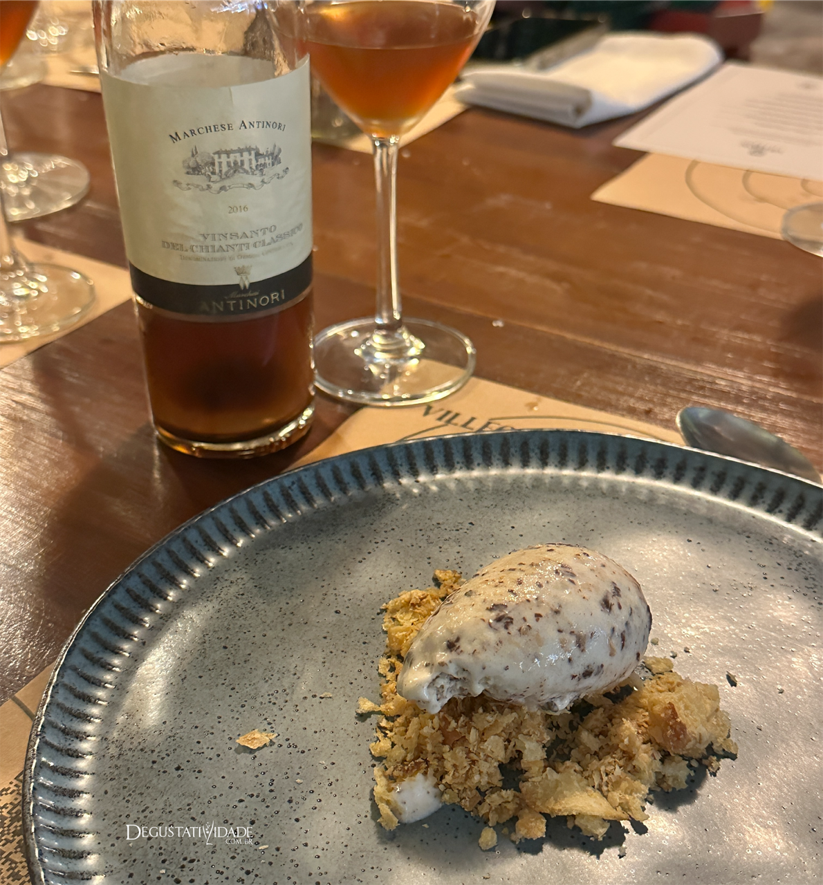 Vinsanto é um vinho licoroso produzido pelo método de appassimento da uva, que secam em esteiras durante 3 meses. Ao ser desidratada, a uva concentra açúcar e sabor. O Marchese Antinori Vinsanto 2016 (R$693) mescla malvasia e trebiano, com passagem de 3 a 4 anos em barril de carvalho. Por si só já seria a sobremesa perfeita, mas que foi um sucesso como sorvete de Pain au Chocolat feito na casa.
