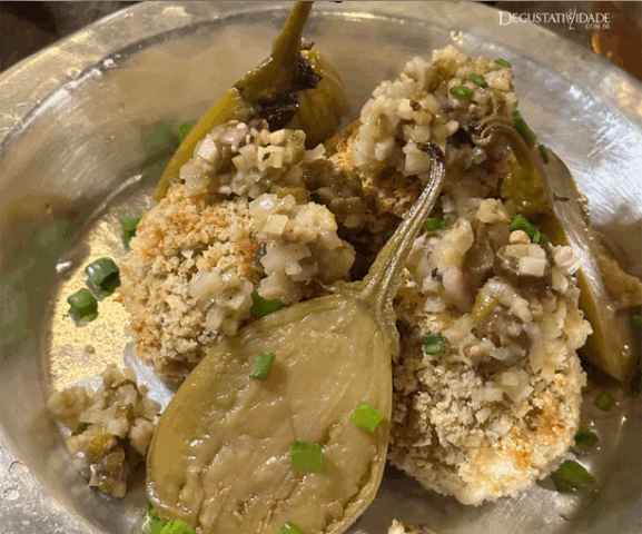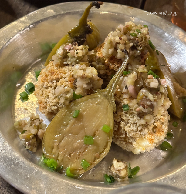 O bolinho de abóbora (R$29) é recheado de queijo com espinafre e me conquistou pela meia banda de picles de jiló que vem junto.