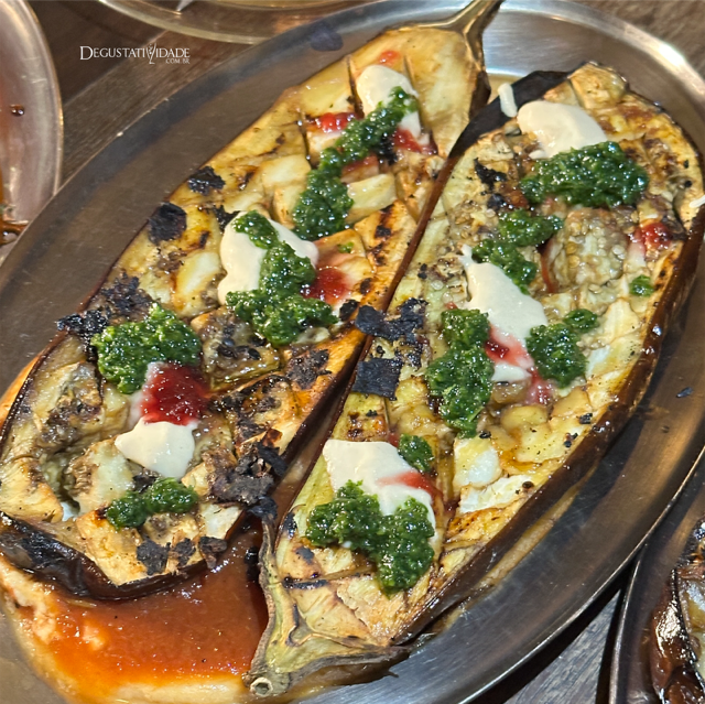Para não sentir falta da carne, seja feliz com a berinjela na brasa (R$35) deitada no homus e molho defumado.