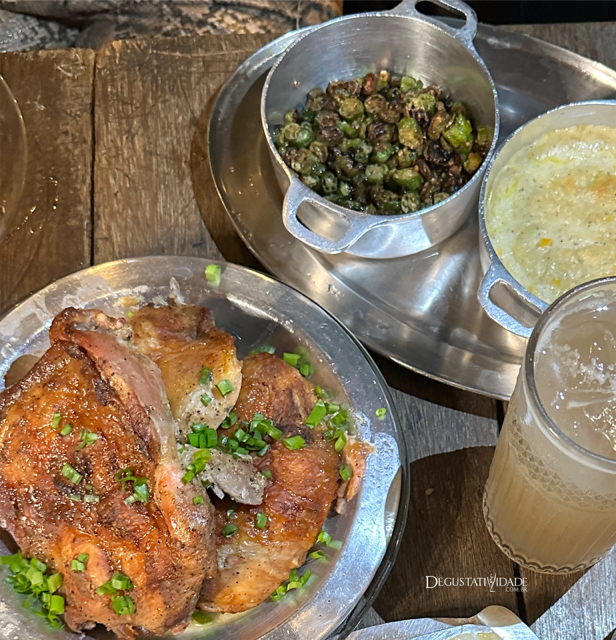e o frango na brasa (R$65) é composto de uma suculenta sobrecoxa desossada acompanhada de creme de milho e quiabo tostado.