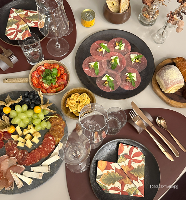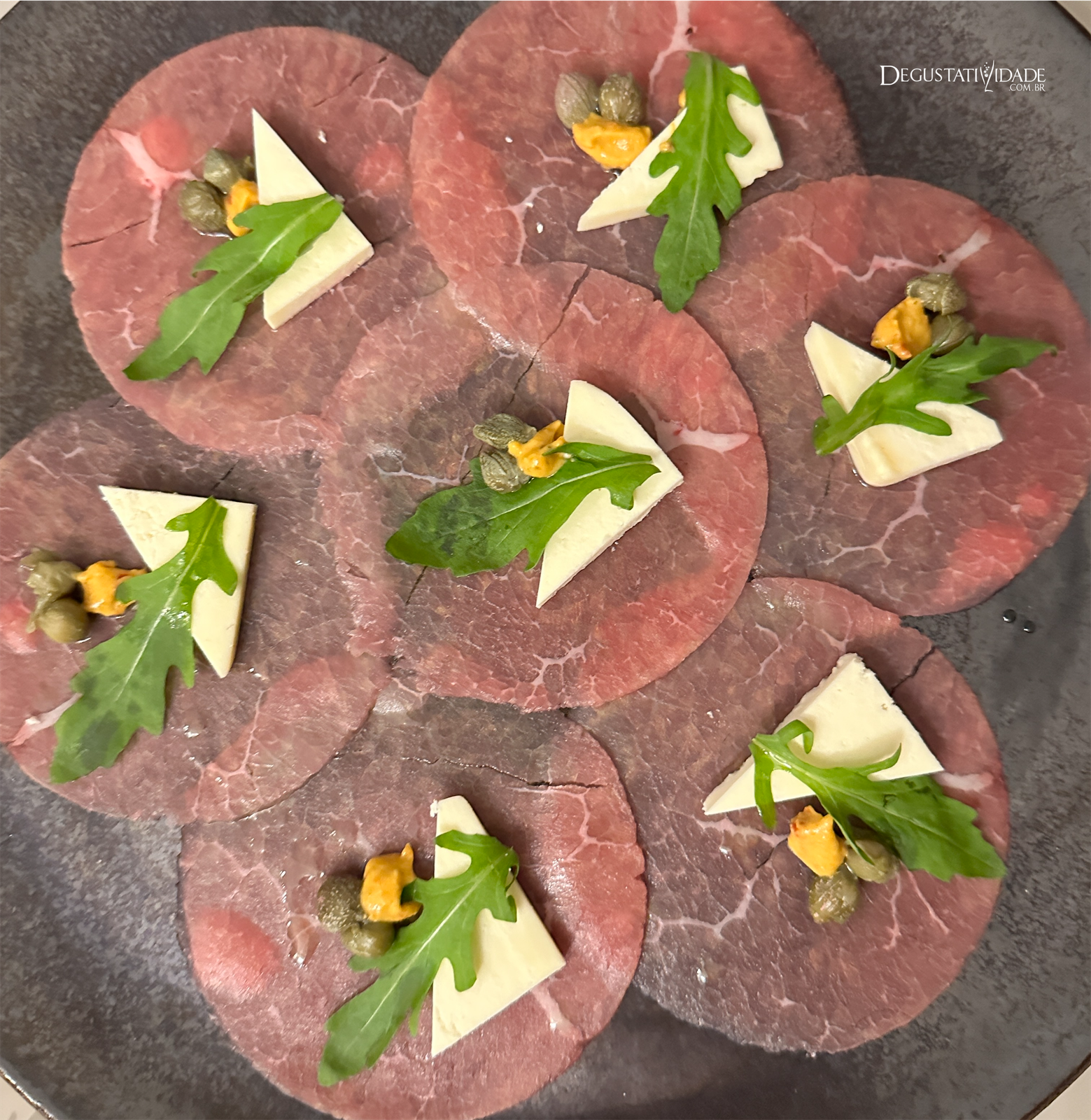 No carpaccio Carapreta coloquei mostarda provençal Fallot, alcaparras, rúcula selvagem e Queijo Minas.