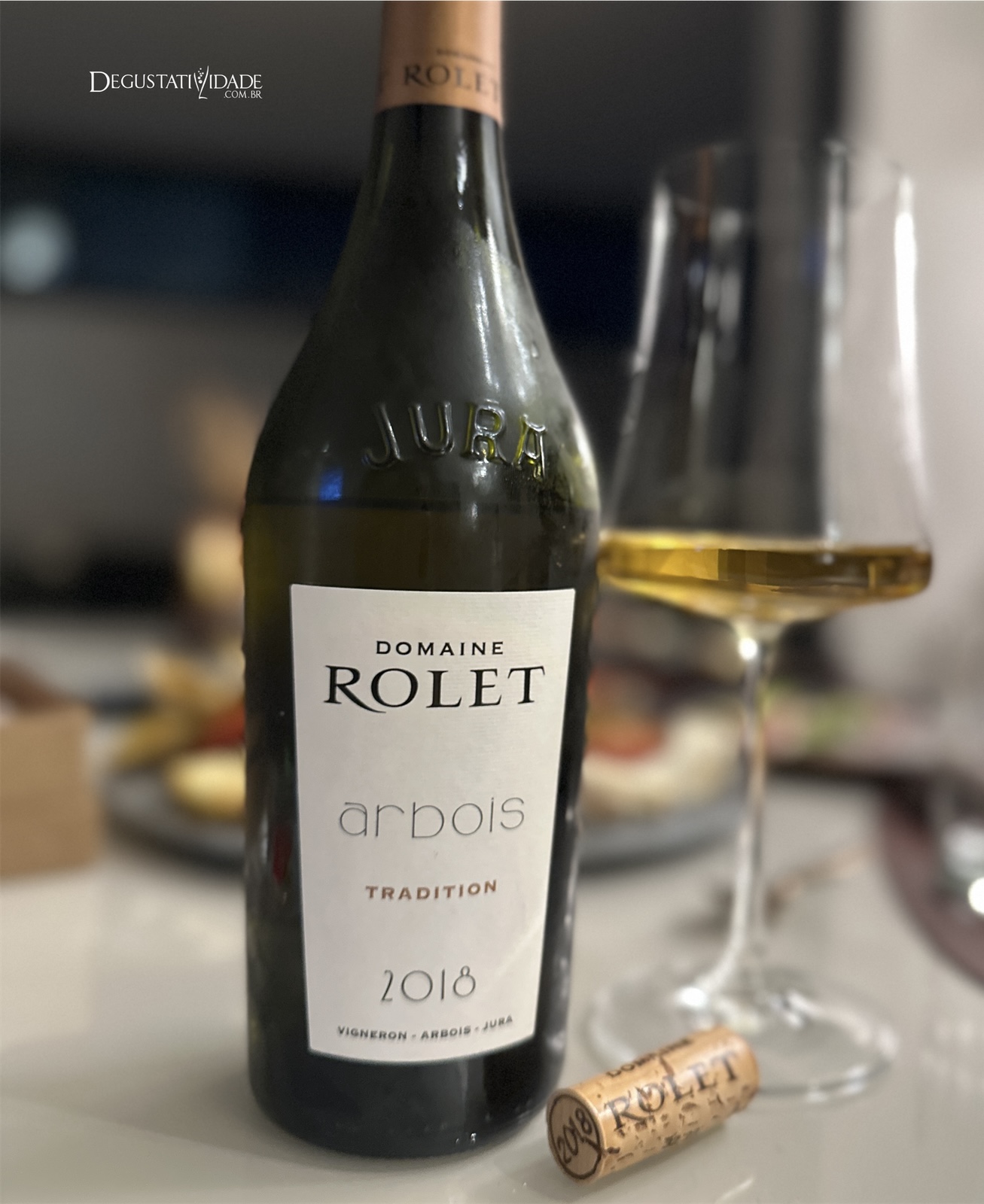 Rolet Arbois Tradition 2018, assemblage de 50% Chardonnay e 50% Savagnin, colhidas de solos de margas cinzentas do Lias e envelhecidas sob o véu de leveduras por 4 meses em barricas antigas.