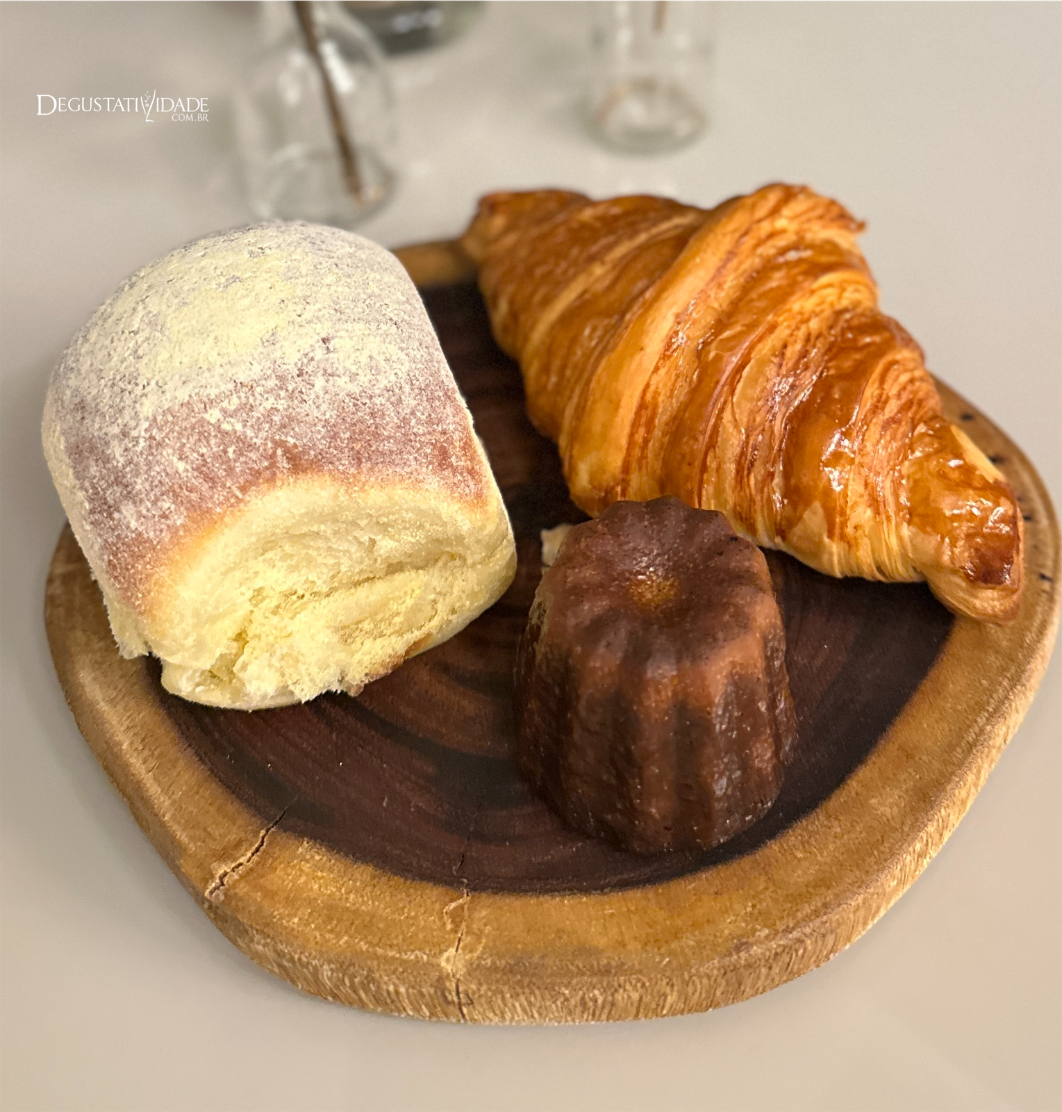 Croissant, pãozinho de milho, baguettine de parmesão e cannelé de Bordeaux da Albertina Paes,