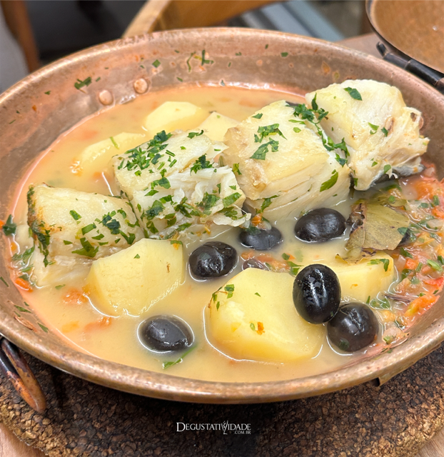 No Caravela, o chef Cristovão Laruça prepara na cataplana o lombo de bacalhau confitado, com batata inglesa, cebolas, tomates, pedacinhos de bacon de fumeiro artesanal e hortelã (R$197 para duas pessoas).