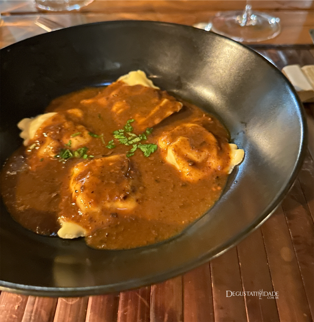 Recheado de vitela cozida por quatro horas, Renato só não usou o cérebro da receita original para a massa feita pela Dona Mirtes Piacenza. Regado por cima do ravióli, o denso molho do cozimento leva tomates e cogumelos secos.