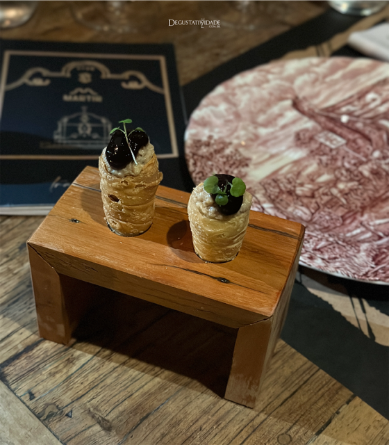 A noite teve início com um cone crocante recheado com patê de fígado de Galinha-d’angola e geleia de jaboticaba.