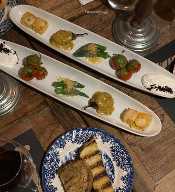 Adoro a entrada “Minas é Muitas”, composta de quiabo enrolado no “lardo mineiro”, jiló na mostarda L’Ancienne, broinha de milho fresco com queijo azul mineiro, tomatinhos assados e coalhada seca de cabra.