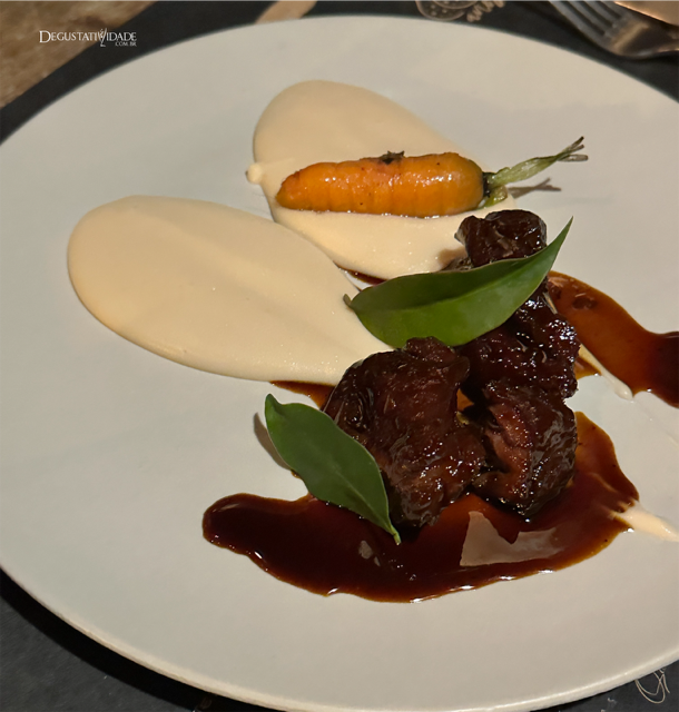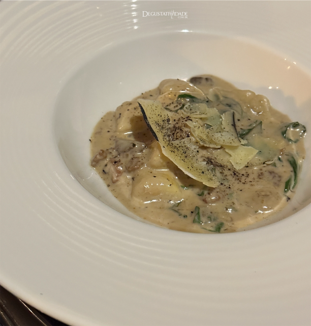 As opções para o primeiro prato principal foram o gnocchi de mandioca com linguiça caipira mineira, guanciale, cogumelo seco, creme fresco, espinafre, sálvia e parmesão d’Alagoa.