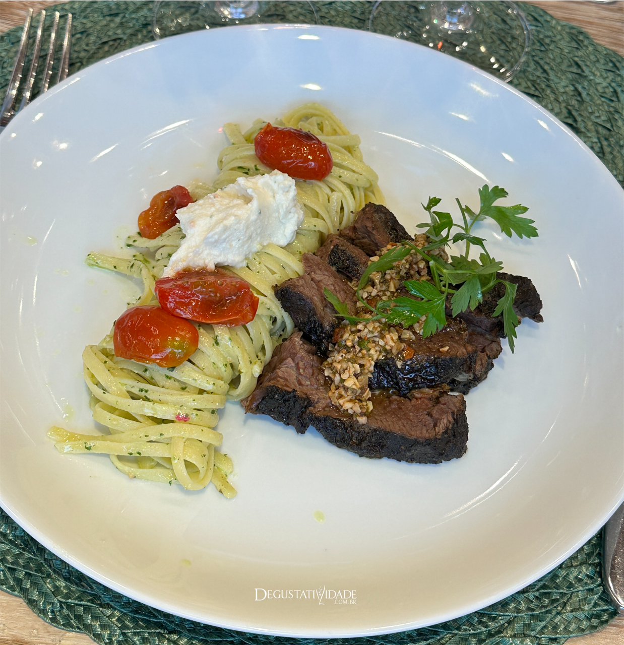 Na sequência foi servida uma fraldinha assada com rub de café e cerveja preta acompanhada de linguine ao molho pesto.