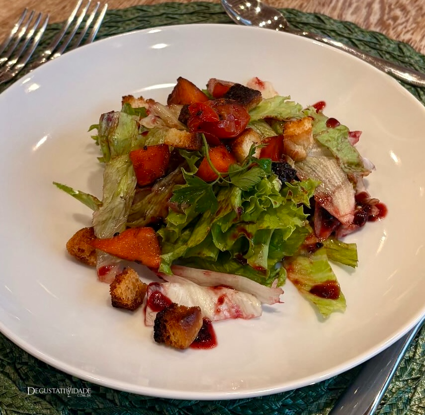 Na última sexta, começamos por uma salada de folhas com cenouras glaceadas no melaço de cana e molho de frutas vermelhas.