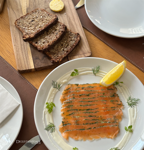 Teve cliente que encomendou meio quilo de gravlax salmão curado com mostarda dijon e dill. A entrada (R$78) acompanha creme azedo e pão de alecrim.