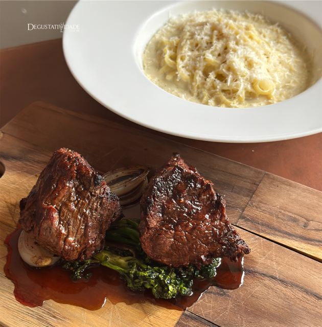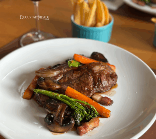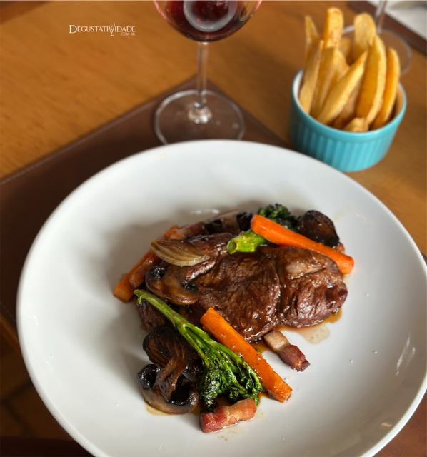A famosa receita Bourguignon ganhou uma versão com o entrecôte grelhado no forno a carvão com cenoura bastonet, cogumelos paris, bacon lardon, brócolis e a amada batata rústica (R$135).