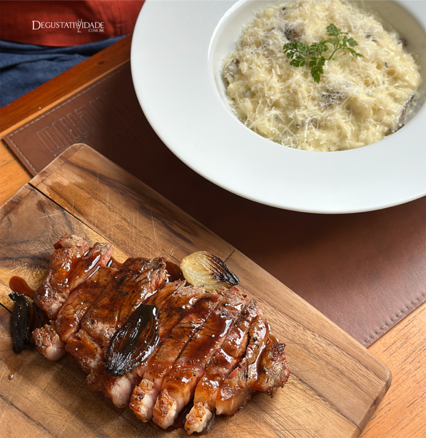 Seu arroz à piamontese com cogumelos entrega bem mais que um risoto (a meu ver) servido com chorizo Angus no braseiro ao denso molho roti (R$131).
