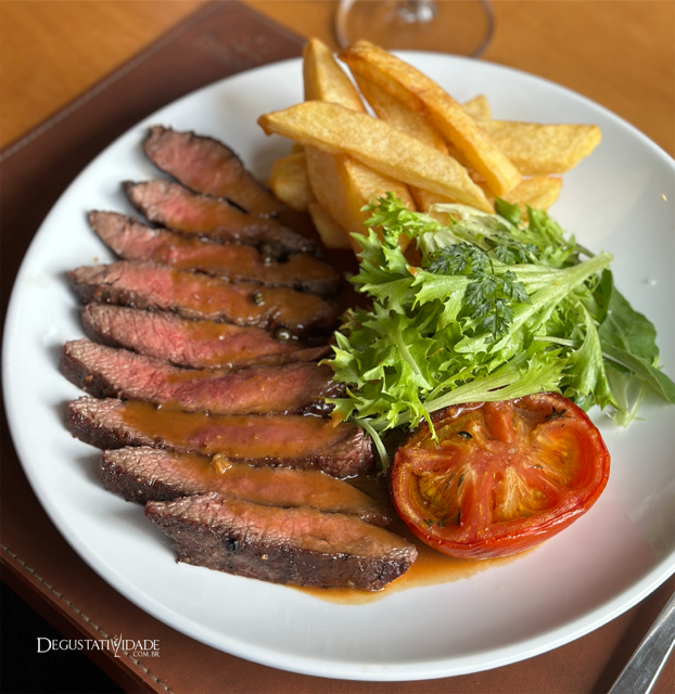 Até o tomate à provençal brilha ao lado do flat iron ao molho poivre com salada de folhas e batata rústica (R$133).