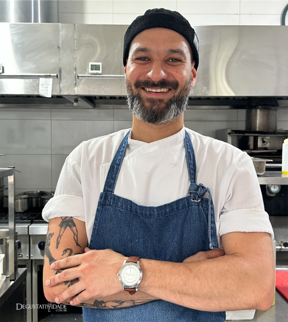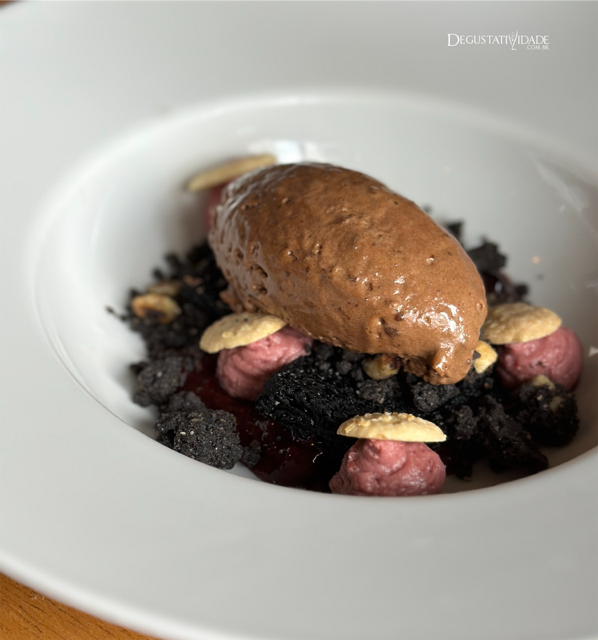 Inspirado na Floresta Negra, o bolo de chocolate 100% cacau se apresenta descontruído com creme de amora, compota de frutas vermelhas, chocolate branco caramelizado, farofa de avelã e mousse chocolate defumado (R$46).