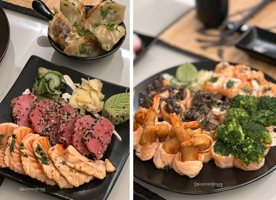 Os “rolinhos” com salmão combinado com camarão, shimeji e brócolis são ótimos também. Dos quentes eu gosto do shimeji na manteiga (R$45, uma quantidade generosa) e do gyosa (R$35 com 5 unidades).