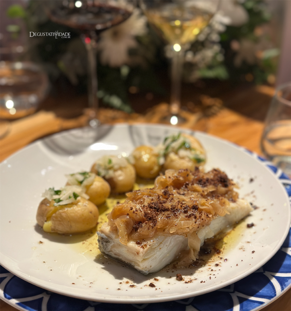 No Caravela, o tradicional Bacalhau à Lagareiro é coberto por cebolas caramelizadas e farofa de azeitonas, servido com batatinhas ao murro e vinagrete de salsinha.
