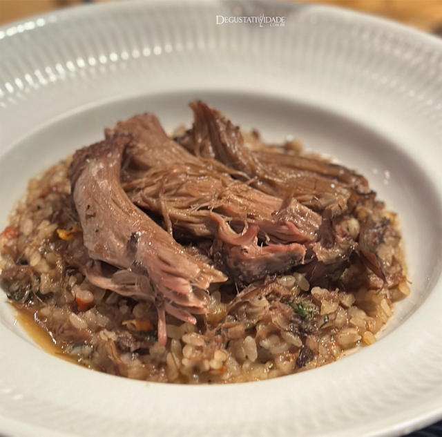 Harmonizou bem com o arroz meloso de paleta de cordeiro preparada à moda do Minho, assada lentamente no forno com alho, ervas e vinho. Ficou um espetáculo com o próximo vinho.
