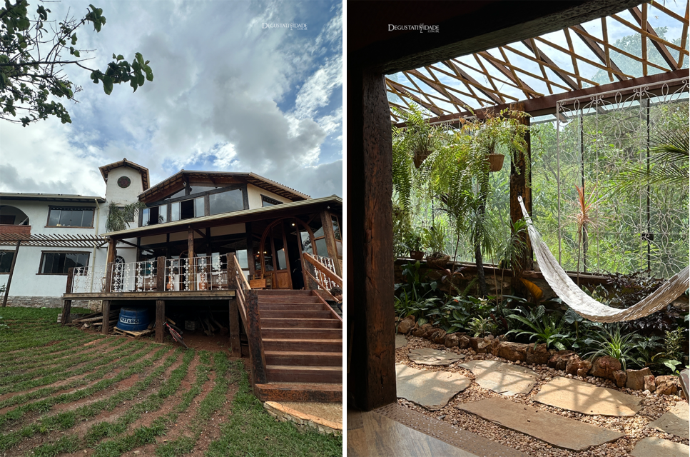 O jantar de quatro tempos harmonizados (R$186 + R$130 com vinhos mineiros e italianos) foi realizado na recém-inaugurada hospedagem de experiências Sempre Viva, voltada ao turismo de regeneração e à conexão com a natureza.