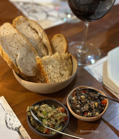 Para a primeira vivência da casa o padeiro Guilherme preparou antepastos de jiló defumado com sete ervas da própria horta e de umbigo de banana com castanha de caju, acompanhados de ciabatta e foccacia artesanais.
