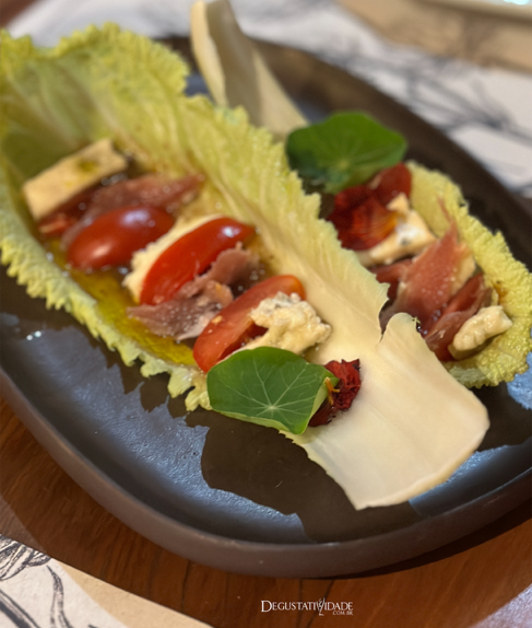 Marina Leite trouxe uma interessante mescla de sabores intensos do gorgonzola com presunto cru da Lapinha e figo e baunilha do cerrado sobre uma folha de acelga.
