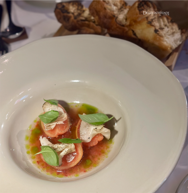 Genial a construção de camadas de sabor a partir de um simples ingrediente como o tomate. Através de técnicas da alta gastronomia como fermentação, defumação, infusão e gelificação o tomate foi descontruído e apresentado em diversas texturas (R$82). “Fazemos uma pasta de tomate fermentado e uma gelatina de tomate infusionada em katsobushi, finalizado com óleo de basílico e lardo para dar um “punch” de sabor”, explica Max Catolino.