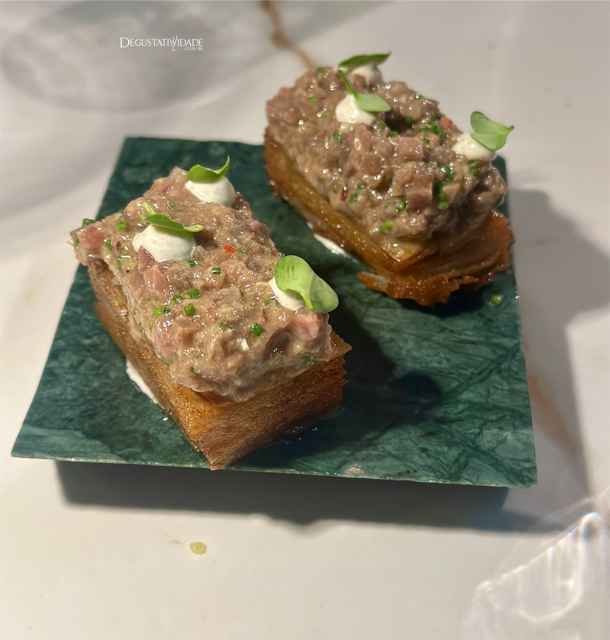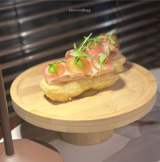 Adorei os duplos snacks de entrada, cada um com sua particularidade de sabor. Em uma massa fresca de pizza, que é feita na hora, vem o peixe curado com dill, gel de cajuína e de pimenta de cheiro, picles de cebola e coentro (R$52).