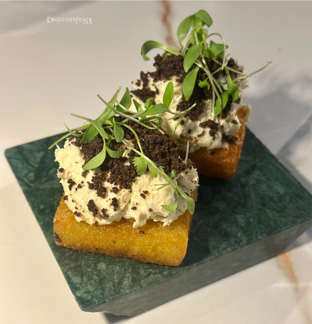 A base de bolinho de baroa recebe o suave creme de bacalhau com farofinha de azeitona preta e brotos (R$74).
