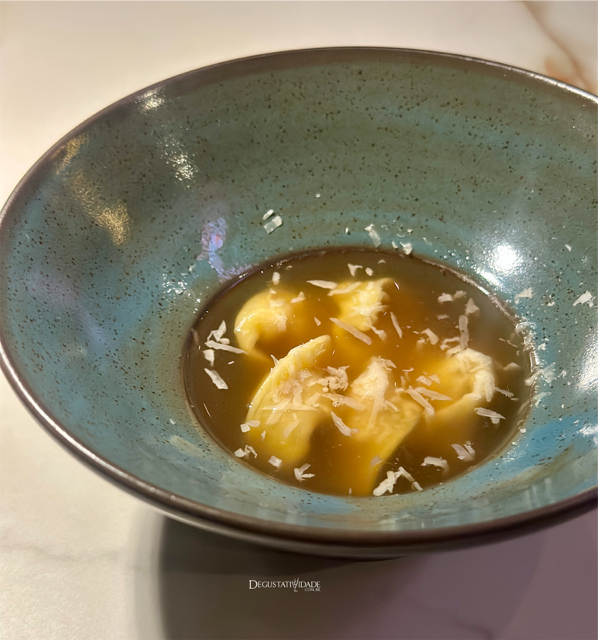 Da ala de pastas, está imperdível o tortellini de porco e galinha d’Angola em um brodo riquíssimo de sabor, com parmesão ralado na hora (R$124), puro conforto.
