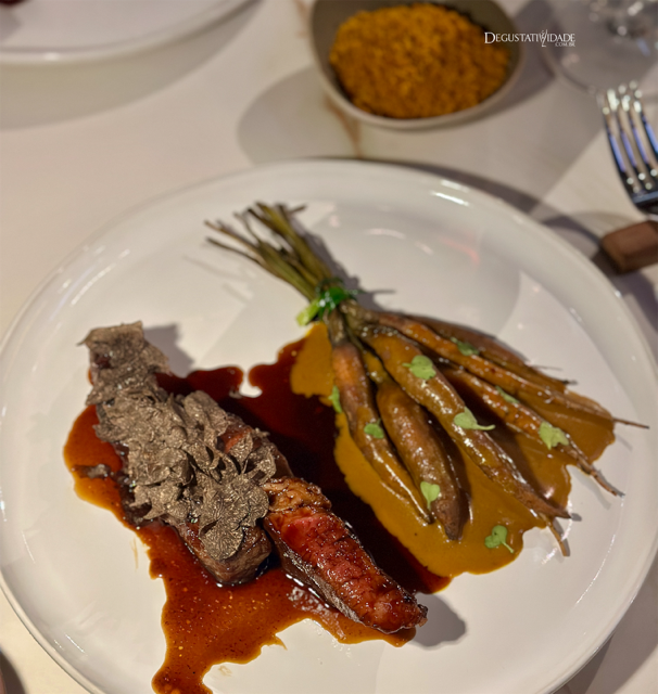 Diversas texturas de cenoura aparecem como guarnição do assado de tira com molhos que levam levedura, café e baunilha (R$162). Trufas frescas estão disponíveis para dar aquela incrementada aos pratos por R$75.