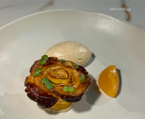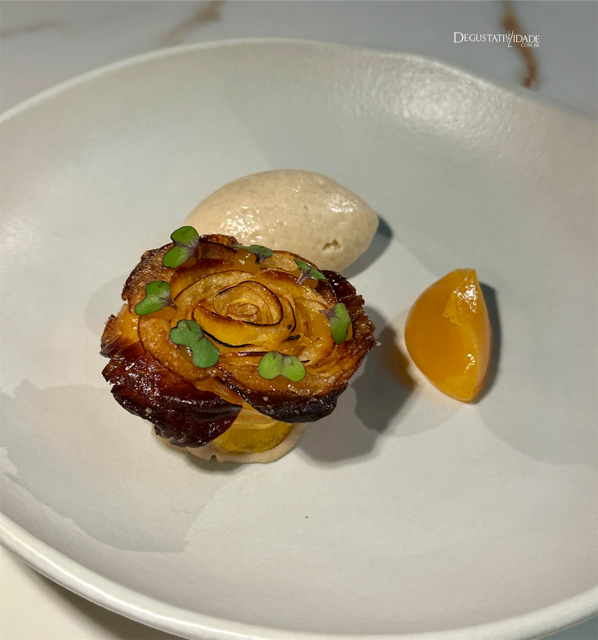 Finas lâminas de abóbora e maçã formam pétalas de uma linda flor com toques de avelã e castanha portuguesa, acompanhada de sorvete de canela (R$52) – que sobremesa elegante.