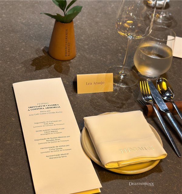 O jantar em seis tempos (R$395) incluiu a harmonização com os vinhos mineiros Syrah Rose da Estrada Real, Syrah da Bárbara Eliodora e Cais Lágrima da Casa Geraldo além de um Sauvignon Blanc baiano e um receptivo com drinks do mixologista Cássio Bastista e degustação de cachaças e queijos mineiros e paraibanos.
