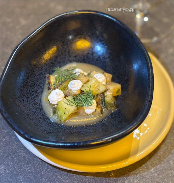 Começamos por uma mescla de sabores cítricos e esfumaçados através do creme de maçã e cubos de maxixe defumado, finalizado com emulsão de queijo de cabra e dill.