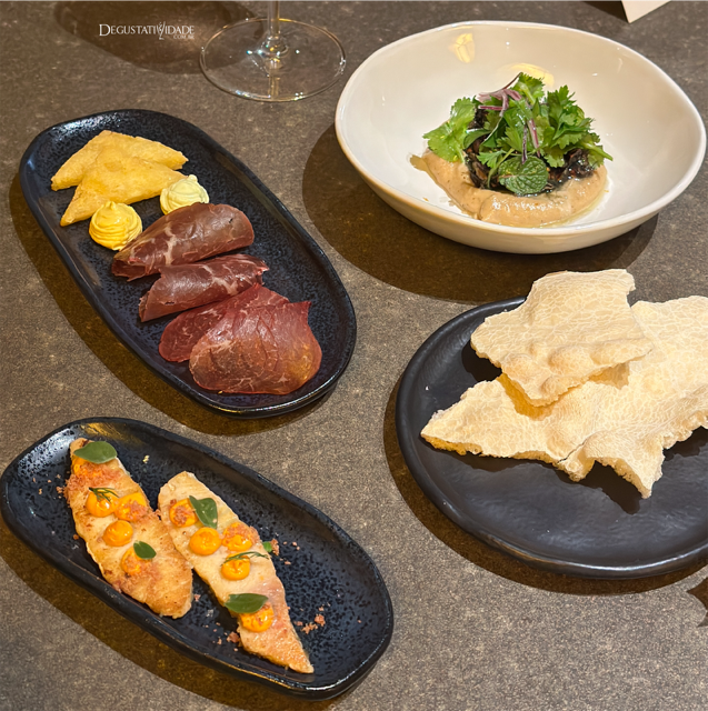 O segundo momento foi composto de petiscos para compartilhar. Adorei o homus de castanha com cubos de caju marinado no tucupi com uma refrescante salada de coentro e hortelã por cima. Foi servido com lascas de biscoito de polvilho. Após ser curtido na manteiga de garrafa, o surubim adquiriu suculência e foi acrescentado ainda de molho ácido de urucum e paio. Veio ainda fatias de bresaola de carne de sol, mandioca frita em forma de triângulos e maionese de pequi.
