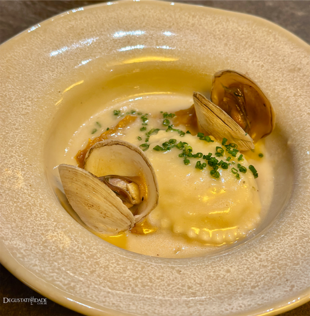 Duas iguarias dos manguezais nordestinos foram apresentadas com sofisticação. O caranguejo foi o recheio do ravióli, servido com mousseline de jerimum tostado e um delicioso caldo marinier de lambretas em nata fermentada. O molusco bivalve em sua concha embelezou o prato.
