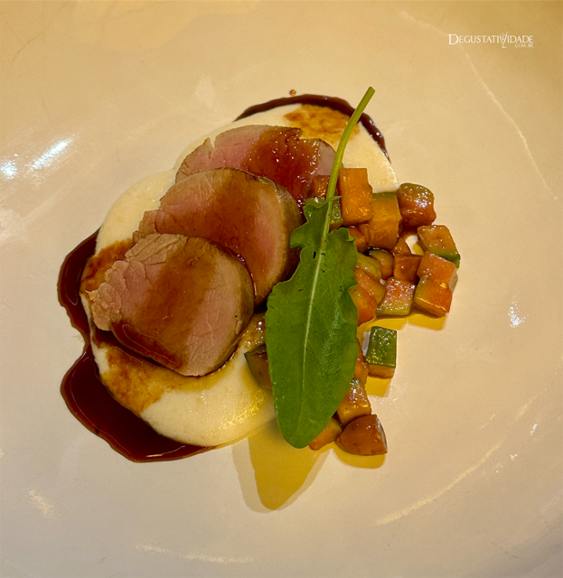 Extremamente macio, suculento e rosado, o lombinho serenado regado por uma densa glace repousava sob um delicado pirão de leite com queijo coalho. Destaque ainda para o vinagrete de goiaba fresca que deu uma excelente acidez ao prato.
