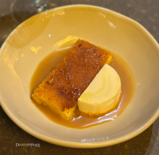 A sobremesa foi um bolo de macaxeira com gelado de queijo de cabra, toffe de rapadura com flor de sal e azeite mineiro Verolí, produzido em Sapucaí-Mirim, na Serra da Mantiqueira.