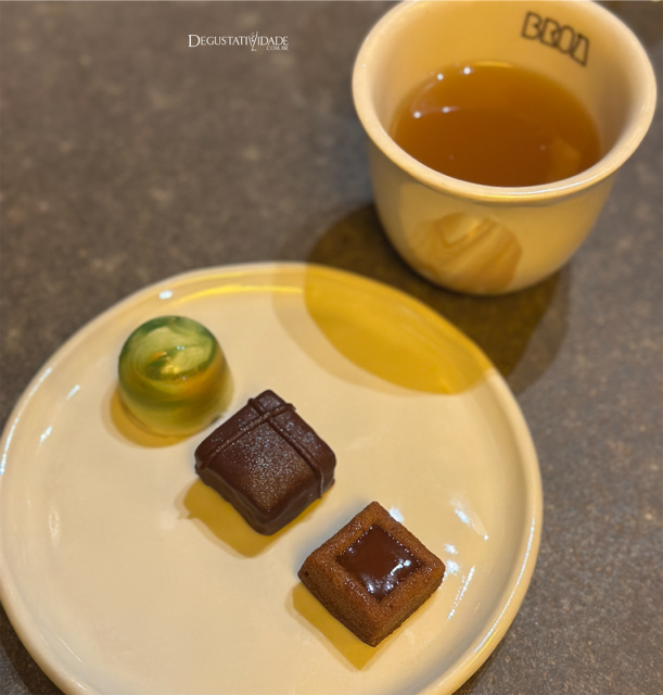 Junto com o chá de capim limão e o café Bourbon Amarelo do Cerrado Mineiro apreciamos um bombom em forma de pé de moleque envolvido por chocolate intenso, outro de graviola com chocolate branco e um mini bolinho paraibano – sorda – feito de farinha de mandioca, rapadura e especiarias.